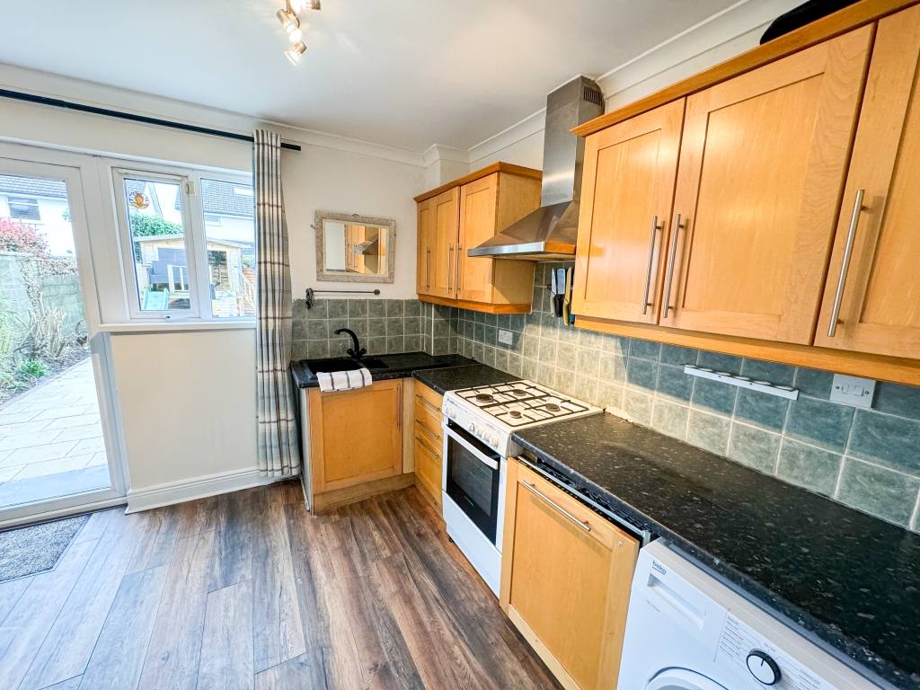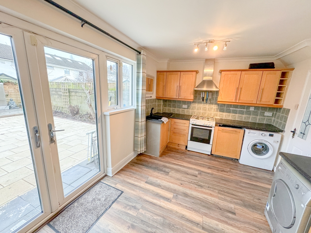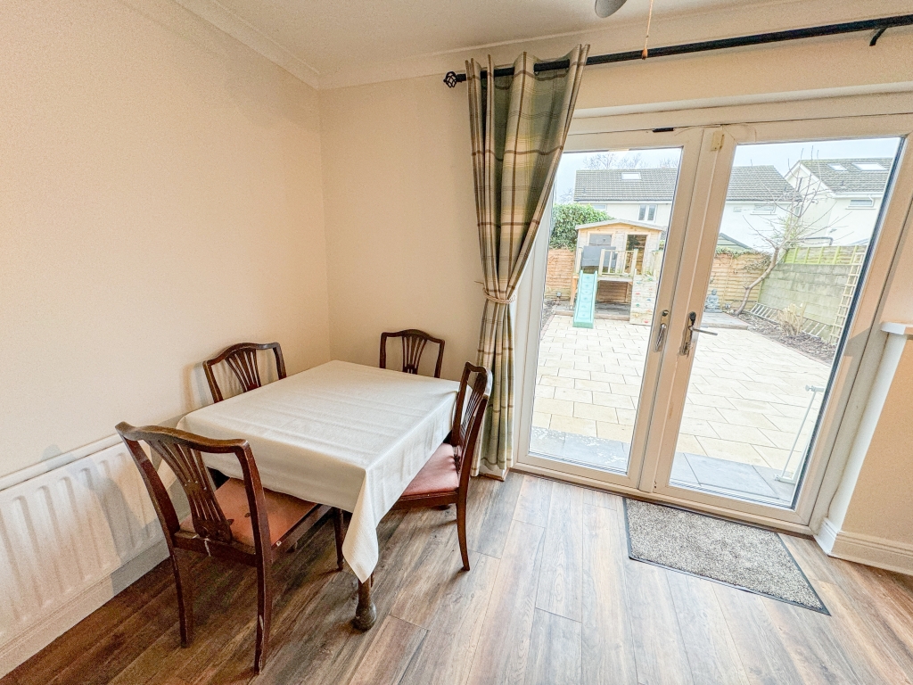 Off-street parking to the front and a side entrance to the rear garden welcomes you at first. Hallway with wooden flooring and understairs storage leads you into a bright sitting room with a stove insert and large window that overlooks the front driveway. An open plan kitchen and dining area to the rear is complimented with ample fitted units, a free-standing gas cooker and French Style double doors that take you out into the sunny rear garden.