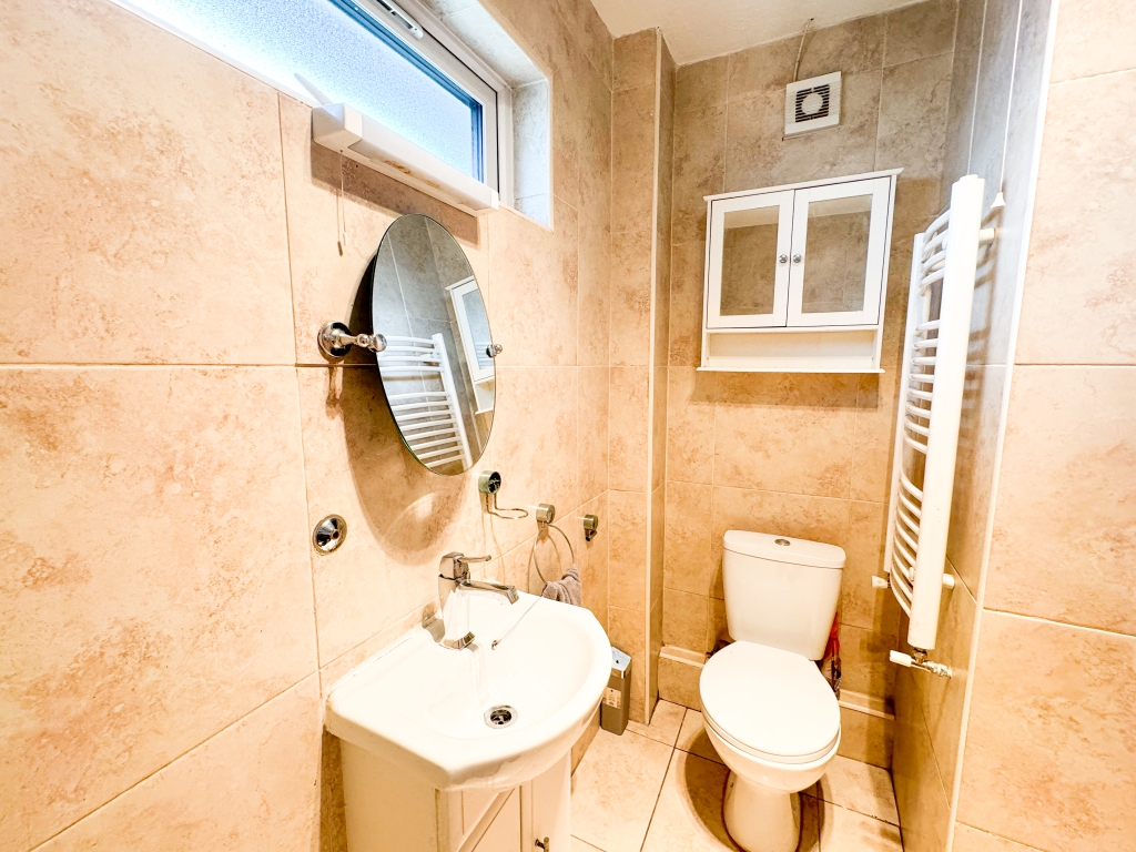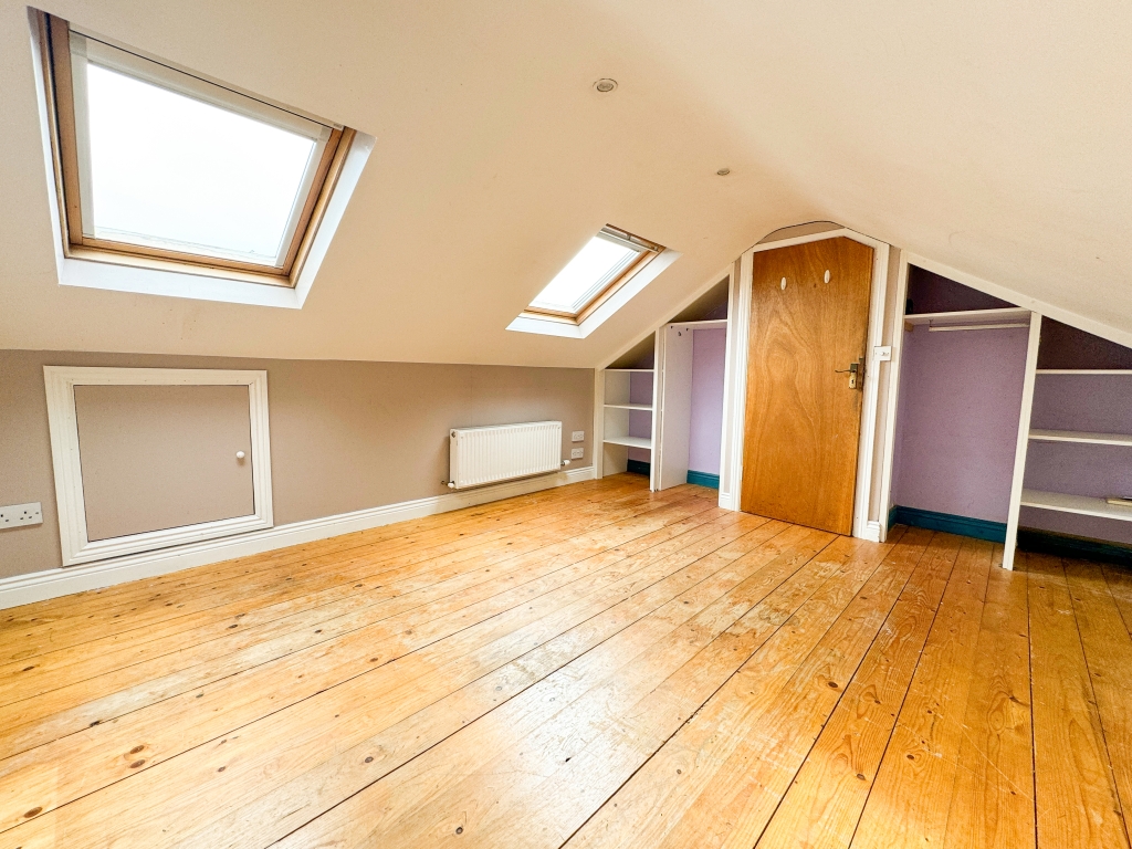Upstairs you are treated to three good-sized bedrooms (2x doubles and 1x single).The master of these bedrooms is positioned to the front with wall-to-wall slide robes. The second double bedroom is located to the rear of the property and has wardrobes and a fitted hand sink. The remaining bedroom is a single to the front; all bedrooms are laid with wooden flooring. Family bathroom is fully tiled and has a 3x piece suite and an electric shower over the bath. Off this landing with the hot press is access to the attic where this space has been converted to create an extra area with 2 x Velux windows.