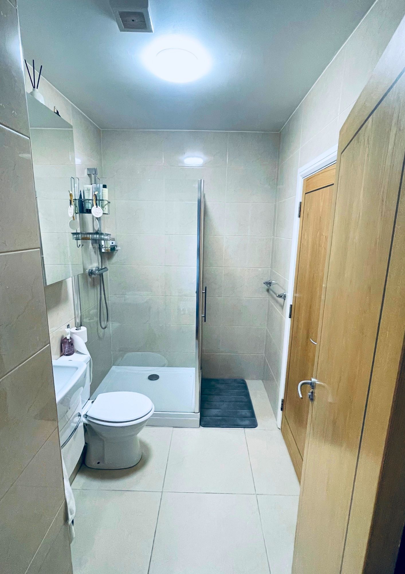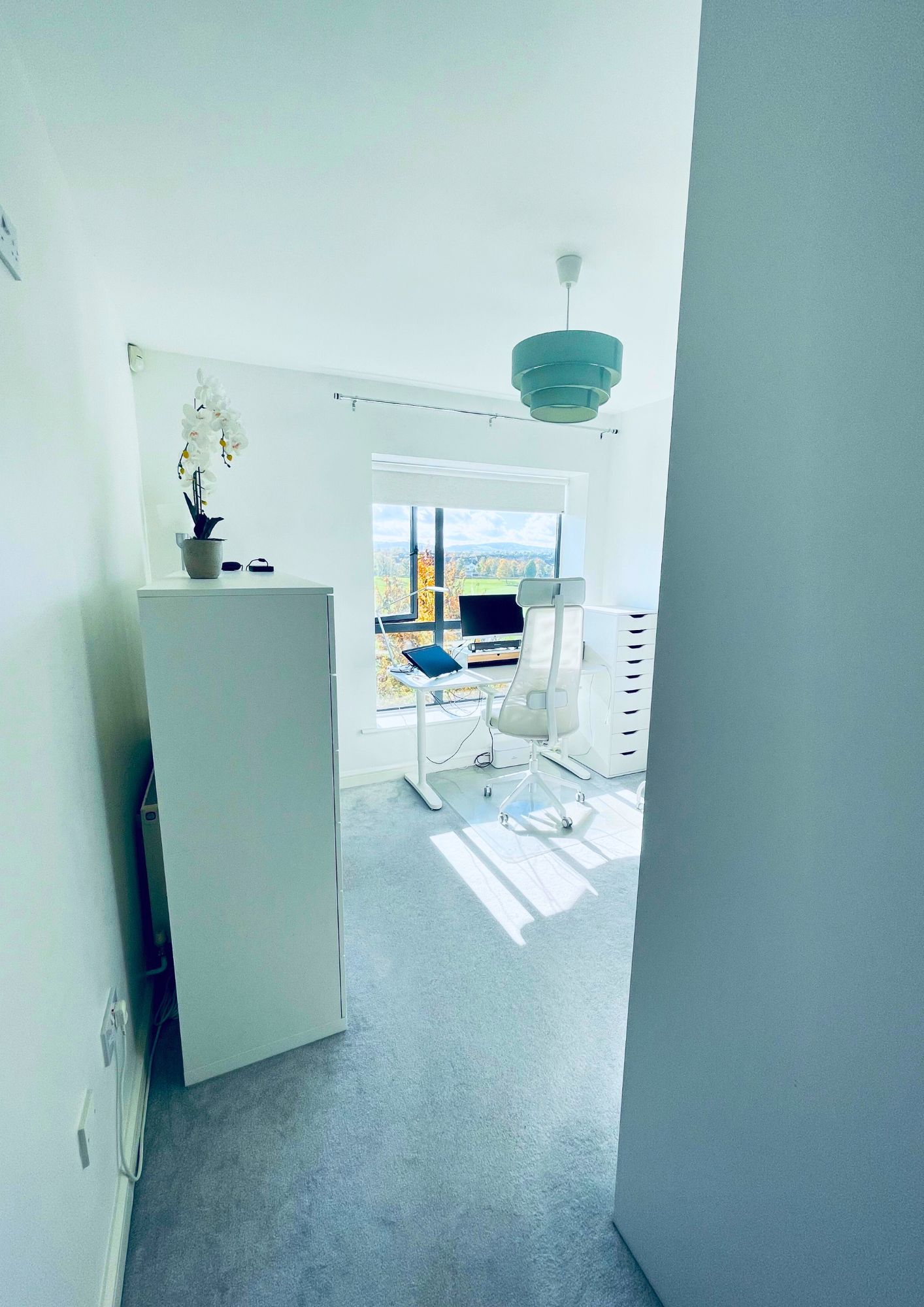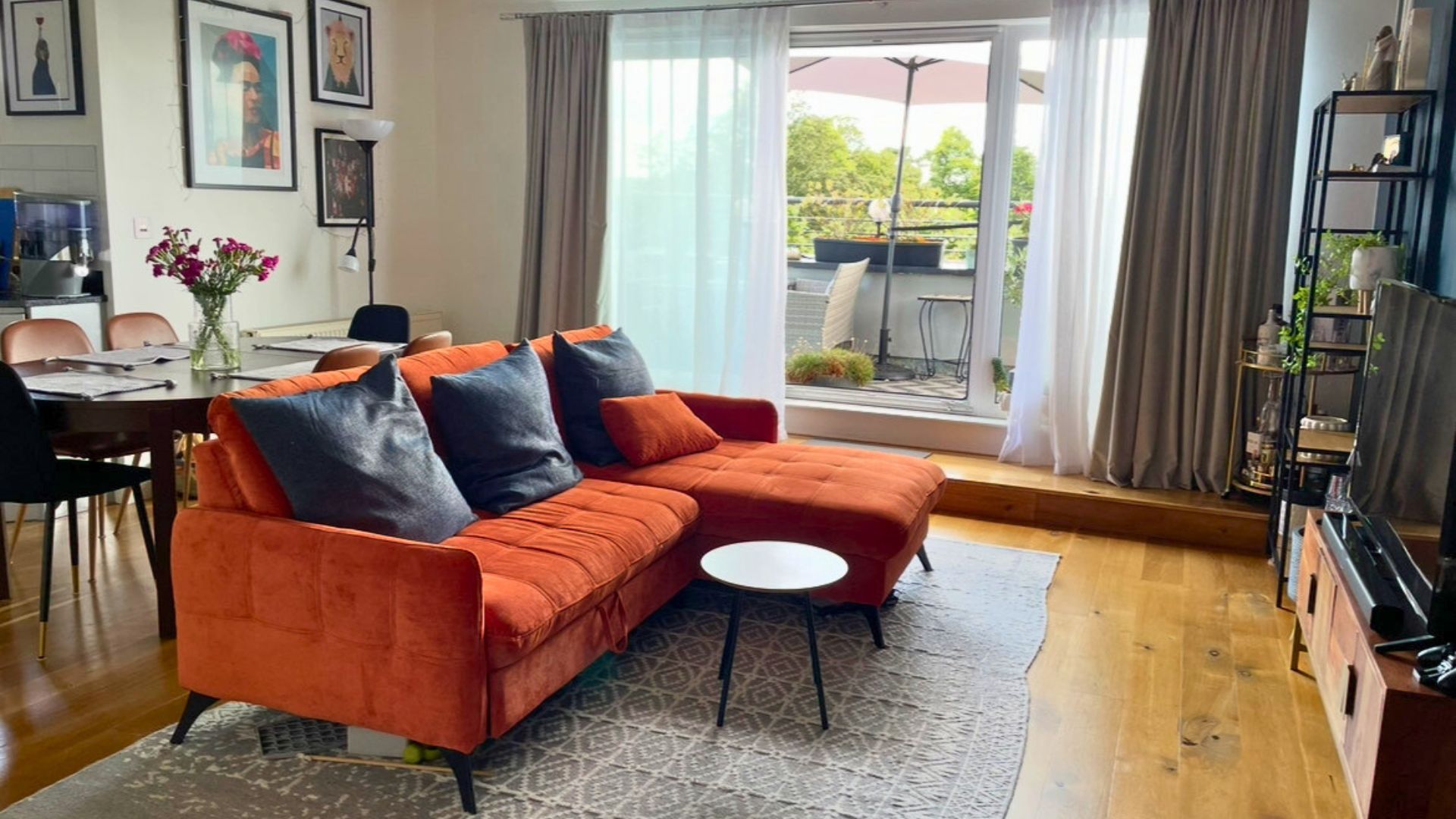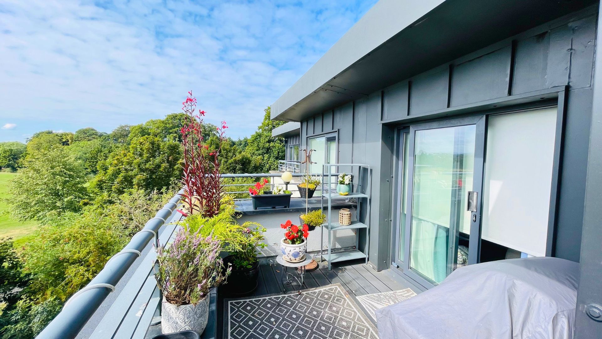 Upon entering the apartment, you are greeted by an entrance hallway with storage cupboards, and the main bathroom with large walk-in shower. Further on leads to the spacious open-plan living/dining/kitchen, which allows access to the balcony, offering unparalleled views of the nearby Hermitage Park.
