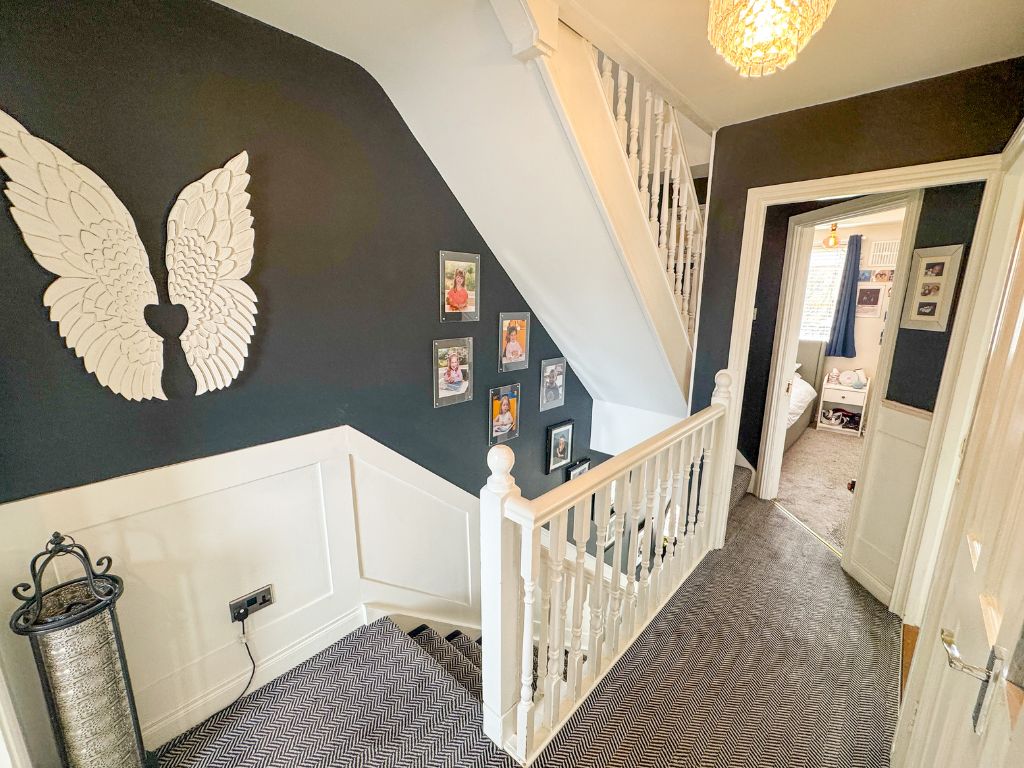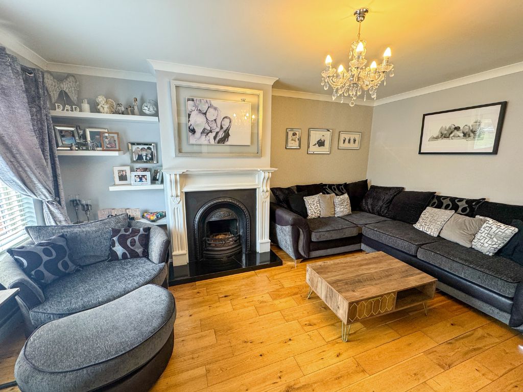 A neat front garden with paving leads into a long hallway with tiled flooring and a convenient guest WC. To the left is a bright and spacious sitting room featuring an open fire that adds to the room’s cosy atmosphere. To the rear of the property the home continues to impress with a high-gloss fitted kitchen complete with built-in cooking appliances. The extension houses a generous dining room and is open-plan with the kitchen. This creates a very comfortable space ideal for any growing family. Additionally, there is an extra reception room off the kitchen which can be used as a home office/gym or a guest bedroom. The kitchen is complemented by a separate utility room that offers plenty of practical space.