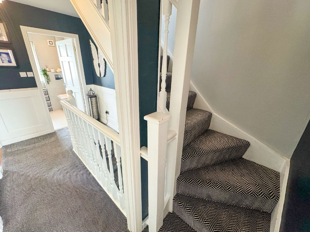 Upstairs the landing is covered in soft carpet leading to three well-proportioned bedrooms—two doubles and one single. Both double bedrooms benefit from built-in sliderobe wardrobes while the single bedroom offers bespoke shelving and storage. The family bathroom continues the high standard of this home featuring full tiling and a modern 2-piece suite – it’s completed with a wet-room-style walk-in shower. Access from the landing leads to the converted attic which features a Velux roof window and benefits from its own toilet and hand sink.