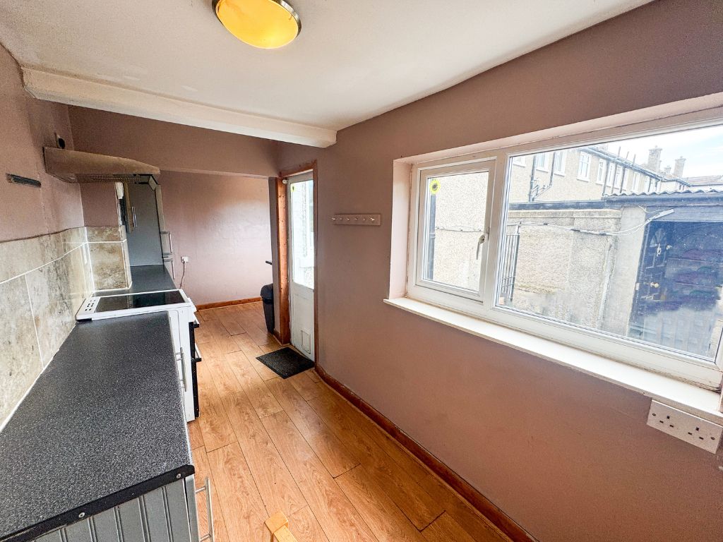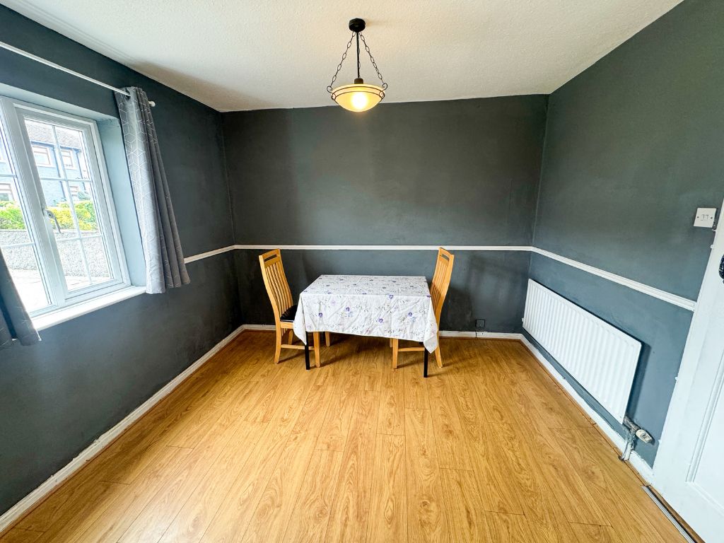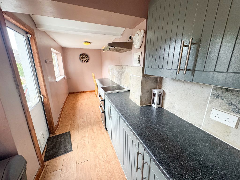 You approach through a gravelled front leading to a side garden measuring c. 2.7m. Next, the side front door opens into a hallway and a full-width sitting room. This bright and welcoming space finished with wood flooring benefits from dual windows that draw in natural southerly sunlight throughout the day. To the rear an L-shaped kitchen is fitted with units and a freestanding electric cooker while also offering access to the back garden. A cosy dining or breakfast area makes this a practical and comfortable family space.