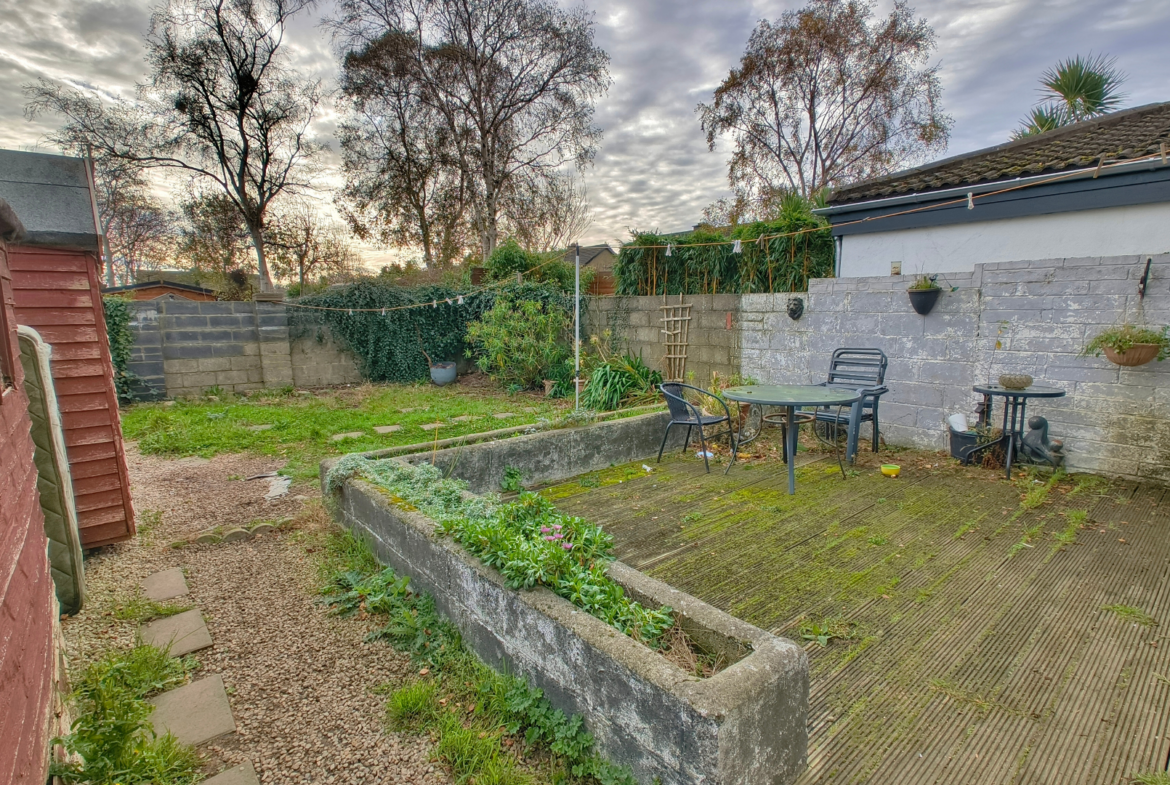 Outside, a large sunny South facing garden which includes a wooden deck area with planter surround perfect for al fresco dining alongside a two wooden storage sheds and concrete area, a grass lawn to rear with a secondary deck seating area surrounded by a high block wall and some mature shrubbery.