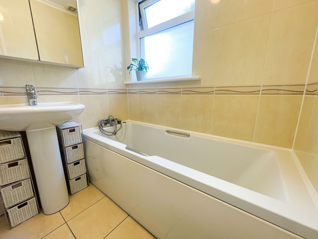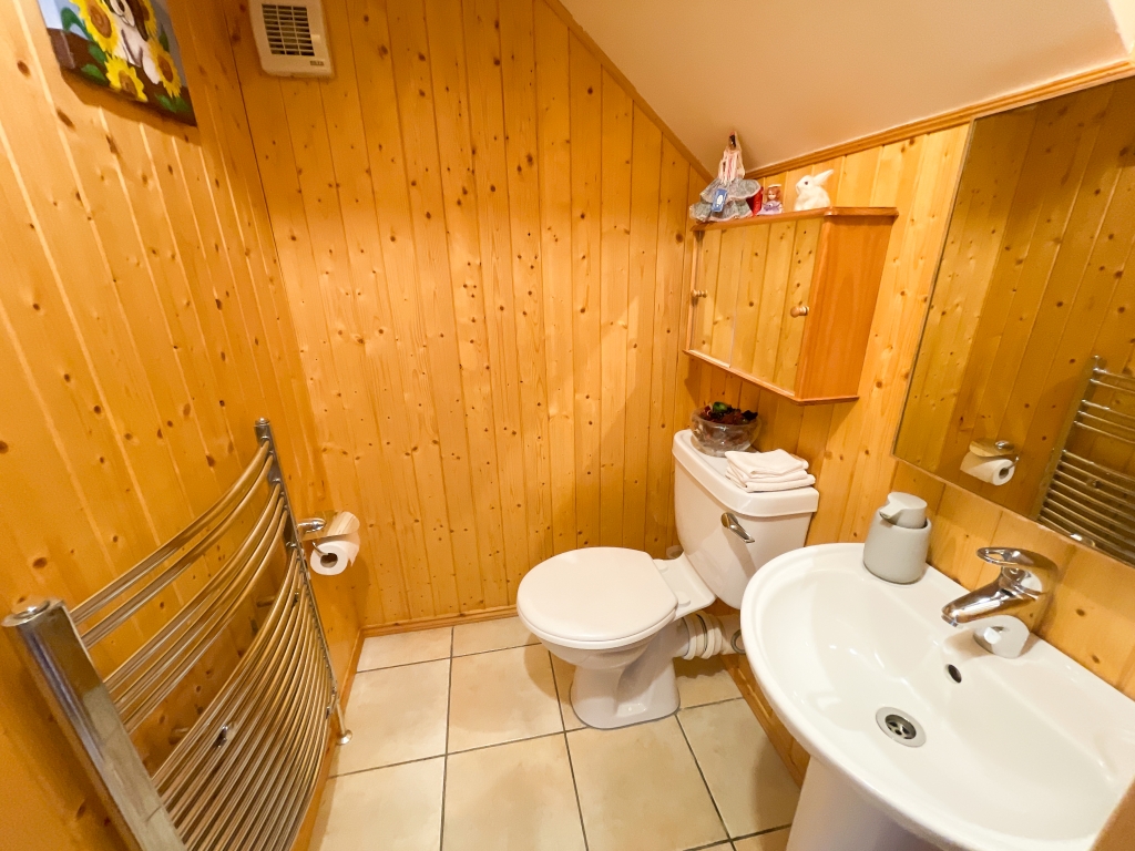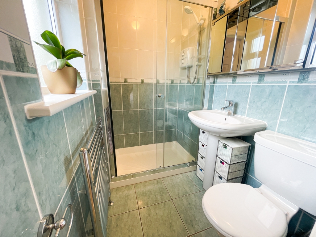 – Fully tiled, 2x piece suite, electric power shower, chrome radiator rail