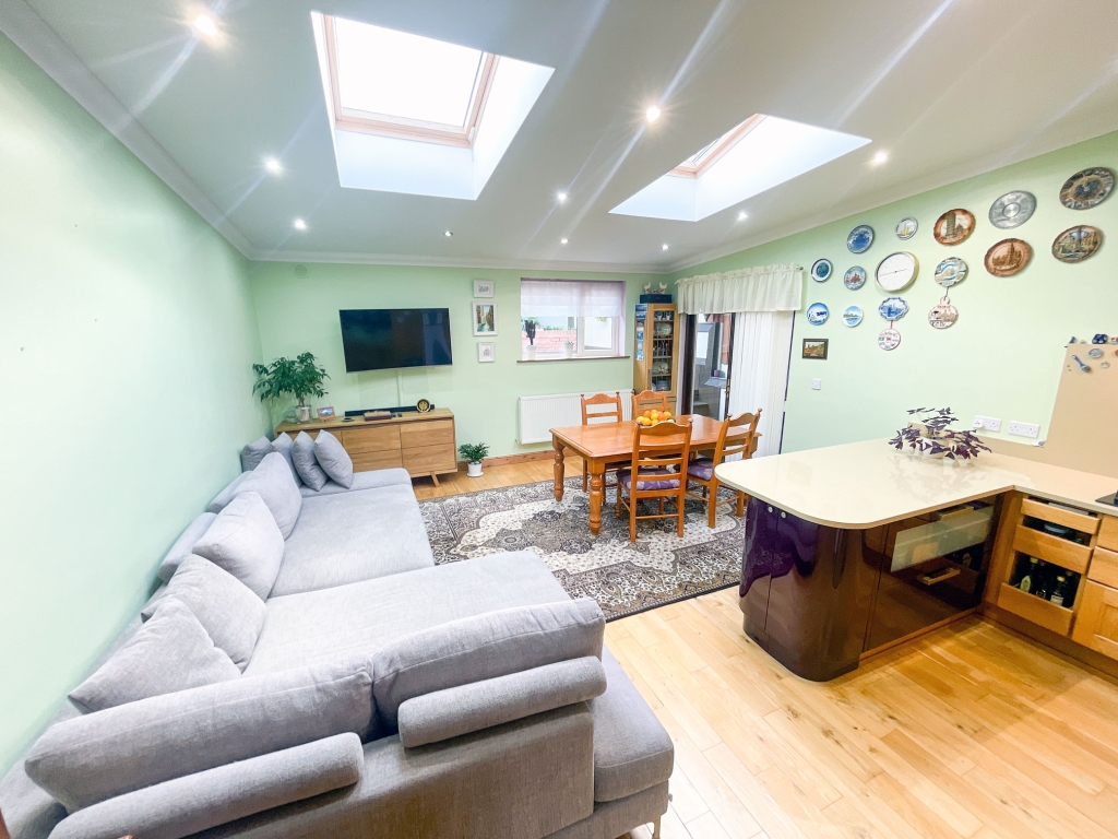Off street parking to front for two cars greets you at first, next you are brought into a long hallway with a guest WC and a separate utility room. Overlooking the front drive and the green open space is the sitting room with a gas fire insert. Continuous natural solid oak wood flooring is throughout the sitting room right through to the rear of the property. Here in the heart of this home you will be treated to a large open plan modern kitchen and very generous dining area with fitted units, built in cooking appliances, breakfast counter and comfortable dining or guest entertaining space.