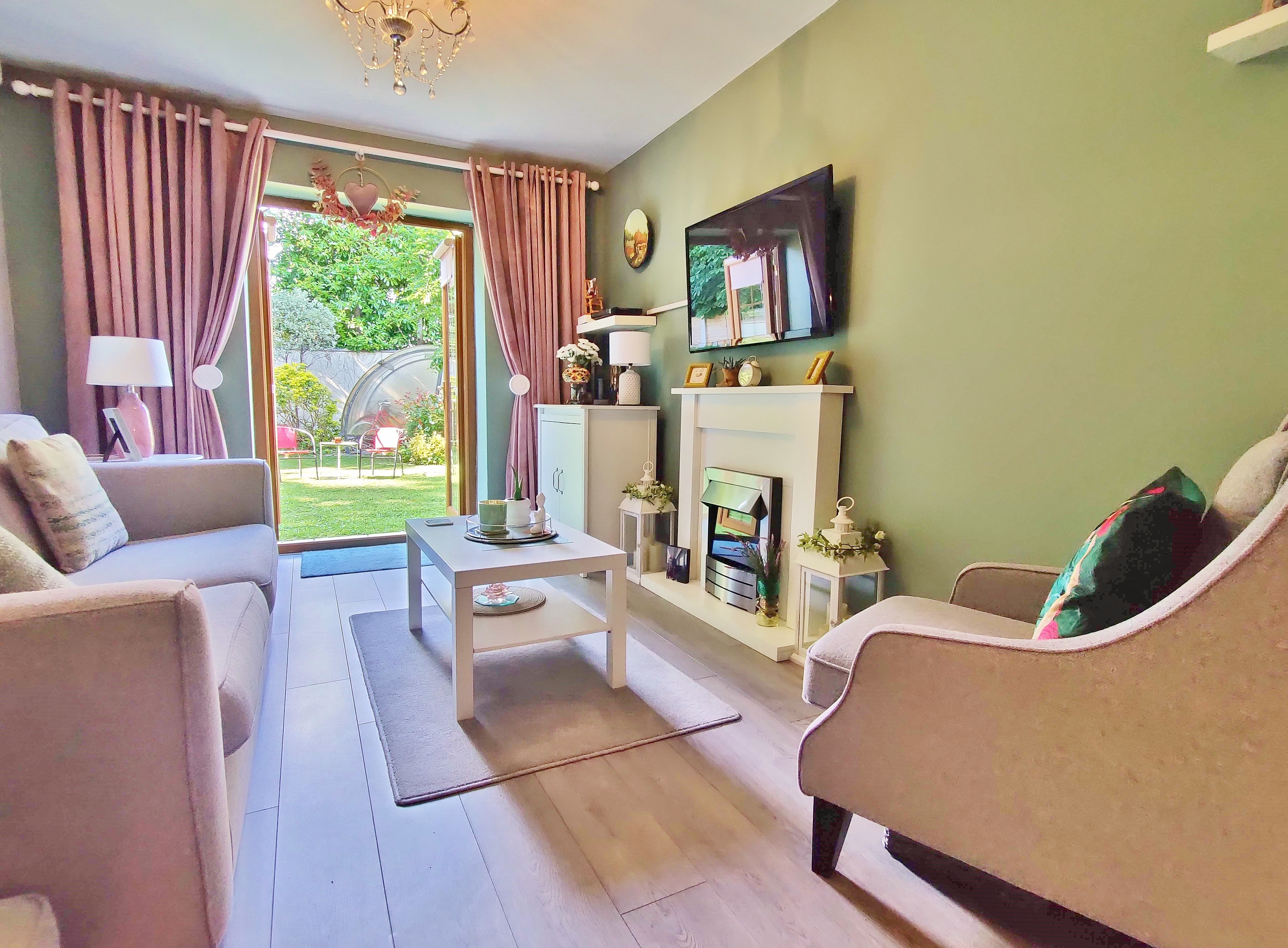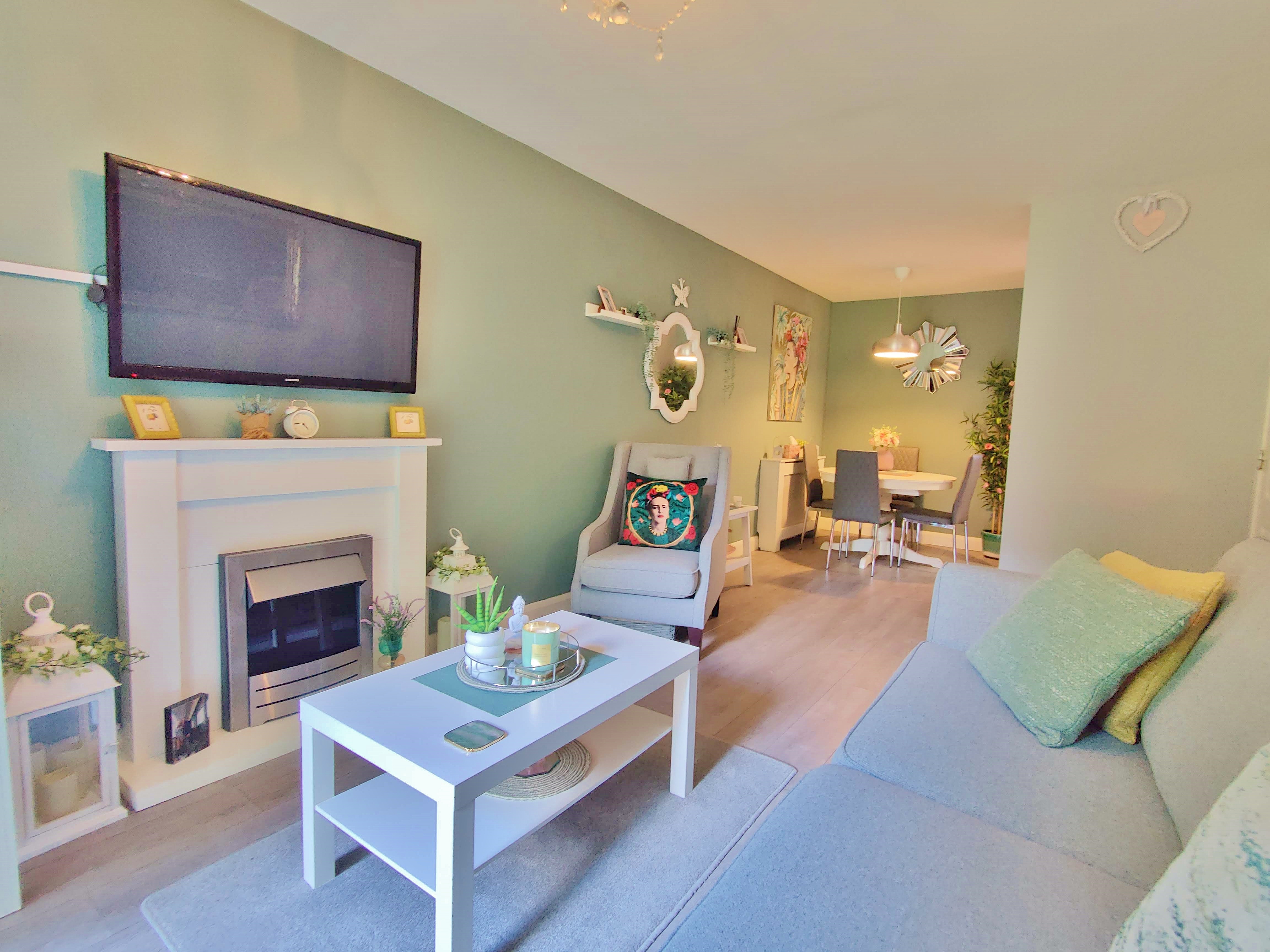 The open plan living room focuses on the fantastic views through double glass doors of the rear garden and the feature fireplace to create a comfortable living space, the dining area is to rear adjacent to the fully fitted modern kitchen with ample storage and worktops.