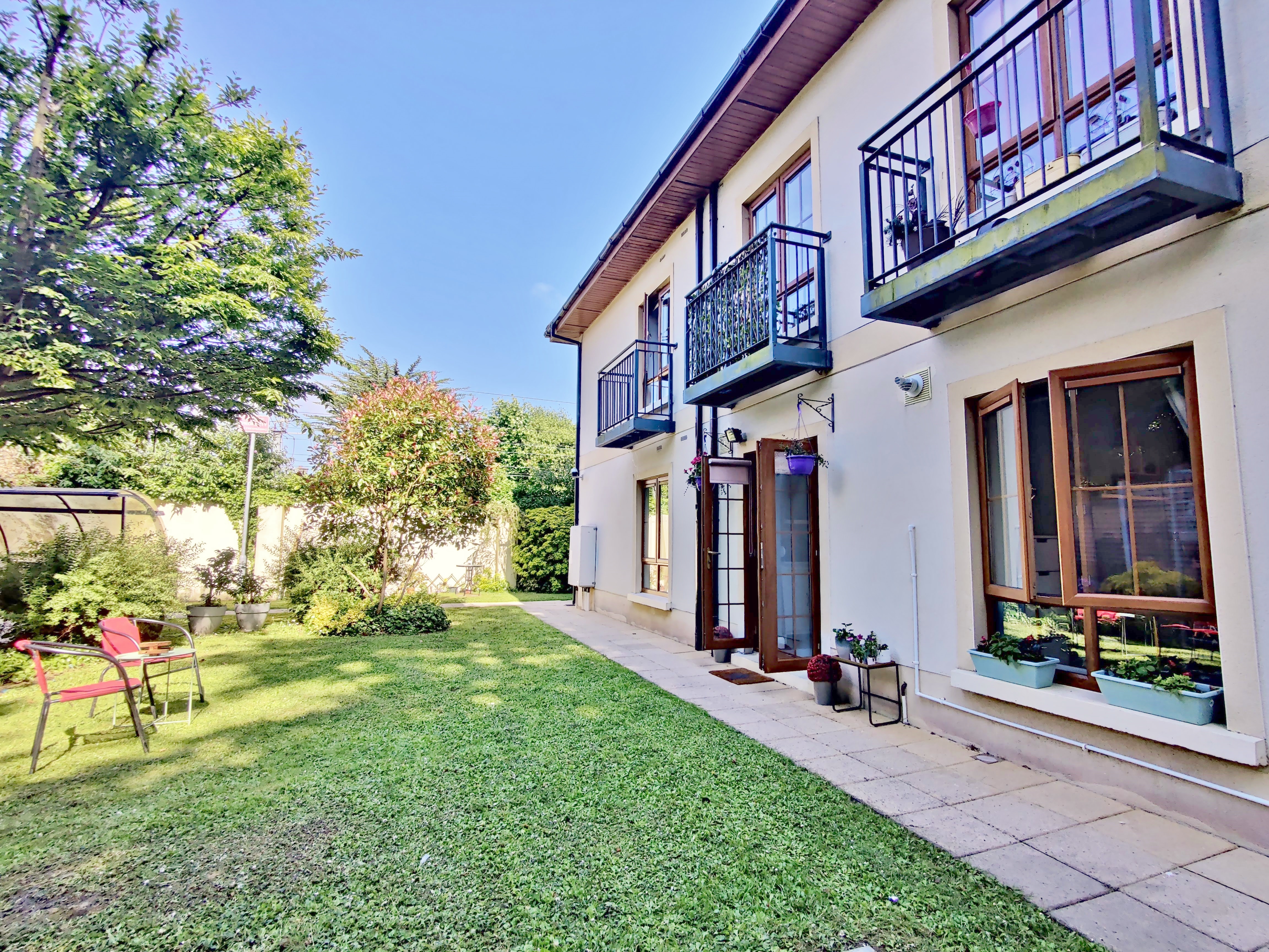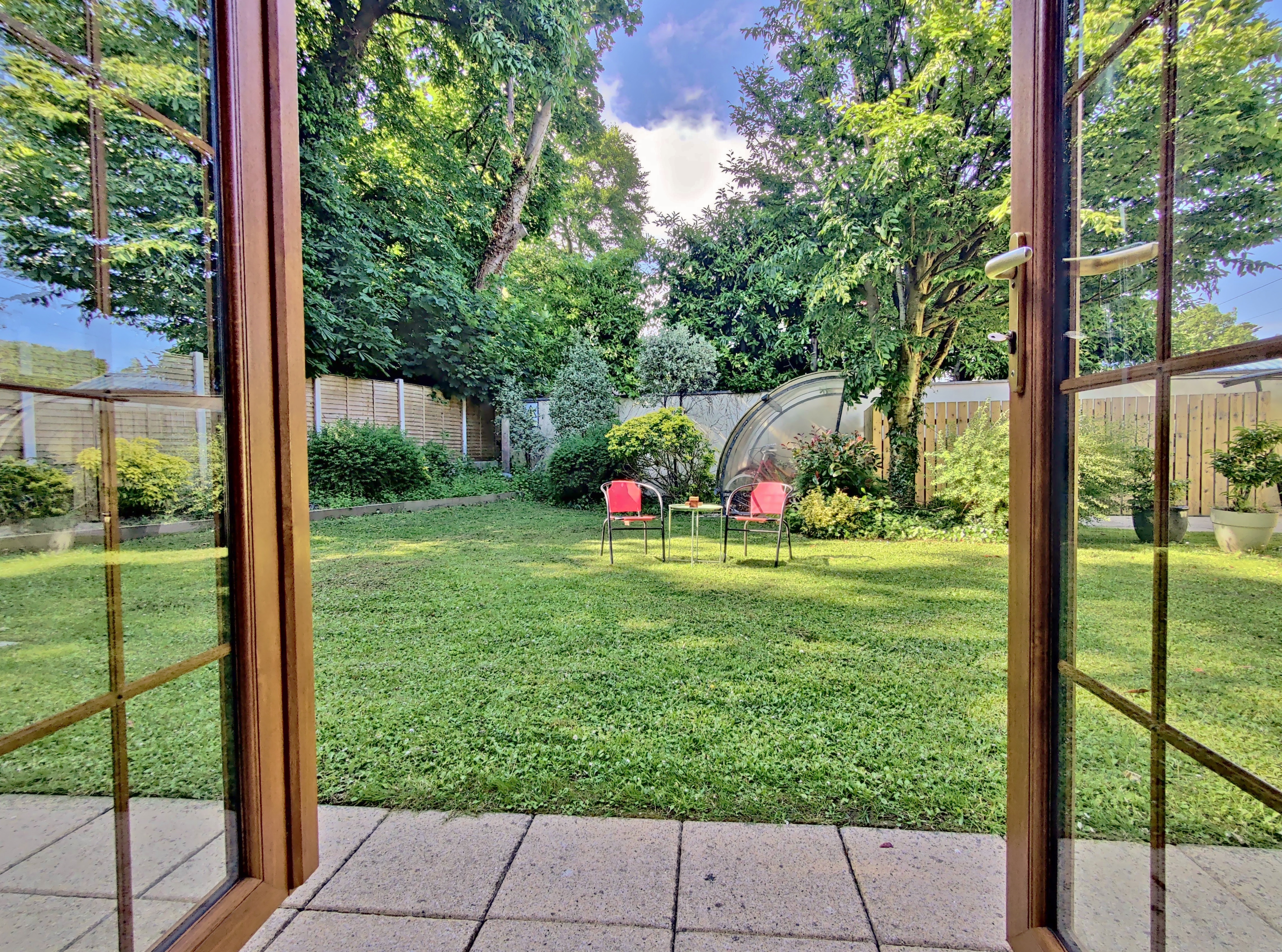 Through the rear double glass doors, a unique well planted and maintained garden common area for the residents however this particular apartment is the only one with direct access. It’s surrounded by mature trees and shrubbery creating a private and peaceful atmosphere to sit out in all meticulously maintained by the development.